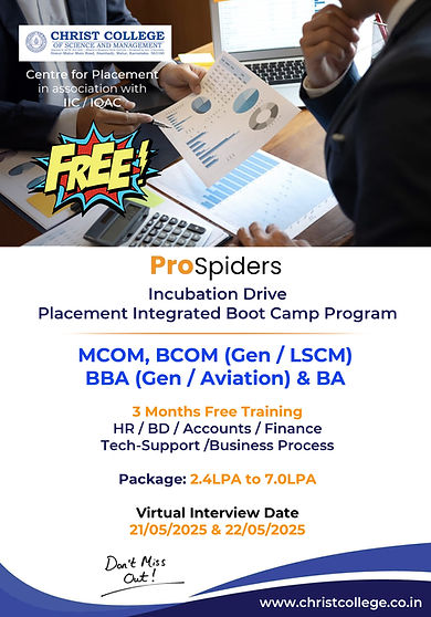 The placement cell of Christ College has had another fruitful year in the academic year 2018-19. A workshop on “Job readiness program for graduate students on a mobile ready cloud-based e-learning format” and guest talk on “Campus to Corporate” were conducted during the odd semester.Training and Placement Cell in association with RATS Technology Training division is offering "Value added courses" for the students of final year from B.Com.,BBA, BCA and BA departments.The programs include: